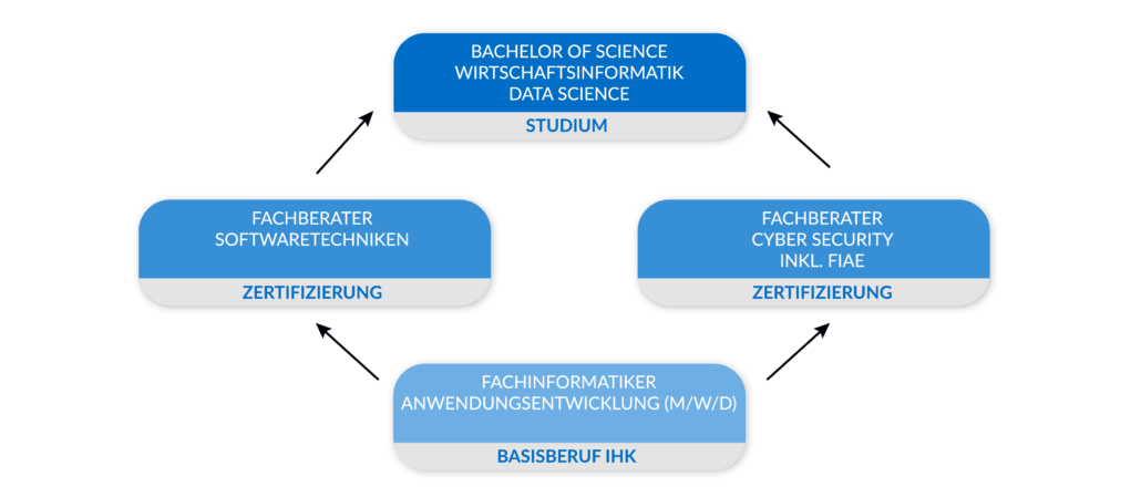 Durch die Nutzung inhaltlicher Synergien und der klug aufeinander abgestimmten Reihenfolge bei der Vermittlung von Kompetenzen ermöglichen wir es den Teilnehmer/innen, innerhalb von sieben Semestern drei Qualifizierungen zu erreichen: den IHK-Abschluss, die Zusatzqualifizierung sowie den Bachelorabschluss.