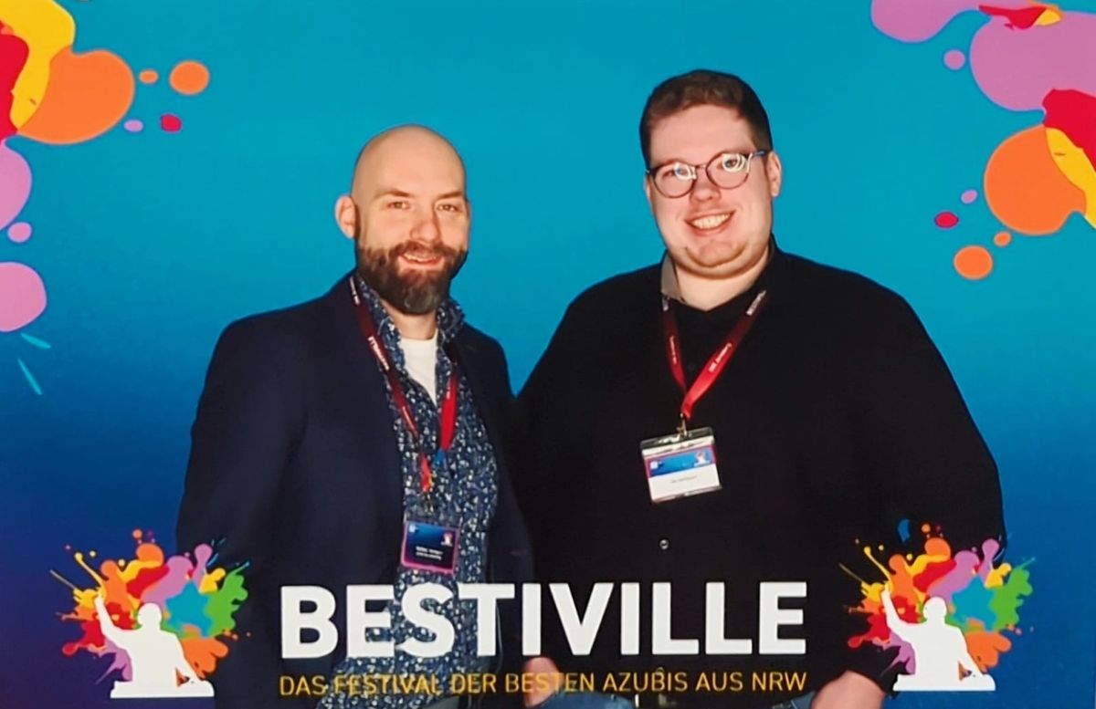 Am 14.11.2025 wurde unser ehemaliger Schüler Jan-Uwe Verheyen zusammen mit weiteren Auszubildenden als Landesbester geehrt. Herr Verheyen hat eine Ausbildung als IT-System-Elektroniker absolviert und bei der IHK-Prüfung die landesweit höchste Punkt-zahl erreicht (Note: Sehr gut). Das Foto zeigt ihn zusammen mit seinem Klassenlehrer Volker Strätgen.